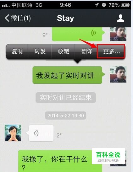 打开一个微信任意对话框,长按一条聊天记录内容,在弹出的选项按钮上面选择“更多”按钮。