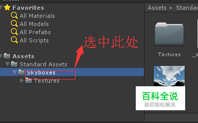 unity内置的资源包中就有好几个天空盒的素材。这里就使用内置资源包中的一个。先导入天空盒资源包。导入后就可以在项目中看到,并选中”Standard Assets“下的”Skyboxes“。在右边的文件预览框中可以看到一个个天空盒资源文件。