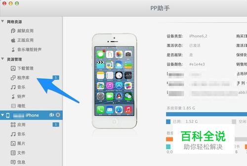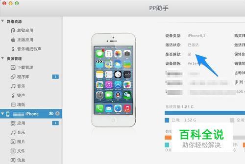 这里以 PP 助手为例,先把 iPhone 用原装数据线连接,打开 PP 助手,点击左侧的 iPhone 一栏,会在右窗格中看到机器的相关信息,可以看到是否越狱一栏显示 “是”,如图所示