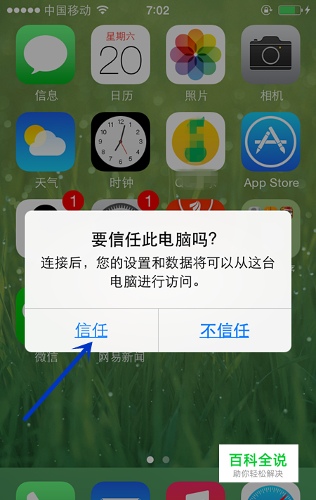双击iTunes图标进入iTunes。手机用数据线连接到电脑的U口上。手机屏幕弹出“要信任此电脑吗?”点击“信任”。