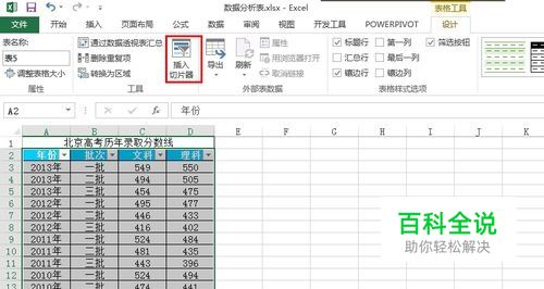 格式化数据后,在菜单栏“设计”选项里可以看到“插入切片器”命令。 注:也可以在“插入”选项卡里找到“插入切片器”命令。