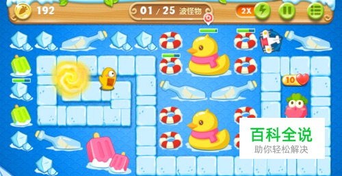 一边打小怪,一边清理下方的大黄鸭. 同时左侧救生圈被打掉后及时补充一个月亮来给怪物减速.在打怪物的同时,前面的冰块也会被打出来,下面是杀掉大黄鸭后暂停的布局.