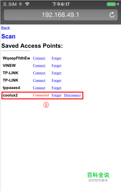 二、苹果手机使用DLNA推送网络视频 以下是使用iPhone5s通过DLNA推送网络视频到Q6的操作过程(兼容AirPlay):①.打开wifi设置;②.连接到Q6的预设名;③.打开手机的浏览器,输入192.168.49.1;④.加载完成后选择第一项以设定Q6的Wifi网络;⑤.选择Scan;⑥.选择本地的Wifi无线网络;