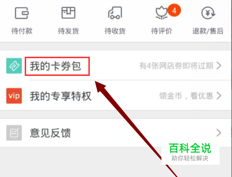 进入淘宝手机客户端,然后登陆上去,再然点击我的淘宝, 我的卡券包如下图所示: