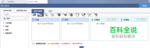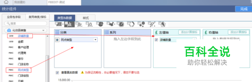 添加分析数据 当进入到组件详细配置界面时,从数据选择区域中,点击化妆品销售业务包,选择销售网络信息表,选择店铺数量添加至左值轴区域。选择网点类型添加至分类区域,此时可以看到如图所示的展示结果: