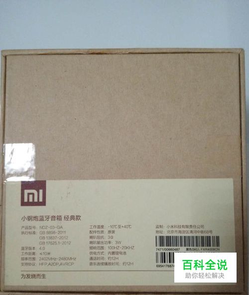在外包装的背面,清楚的写着小钢炮的相关参数 产品型号:NDZ-03-GA 工作温度:-10~+40度 执行标准:GB8898-2011 配件性质:原装 GB13837-2012 GB17625.1-2012 喇叭输出功率:3W 蓝牙版本:4.0 频率范围:100HZ-20KHZ 工作距离:<10米 供电方式:内置锂电池
