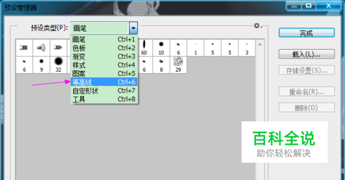预备工作--载入等高线 在下面的一些图层样式操作中,你可能需要载入等高线。请照做,选择编辑>预设管理器,选择来自预设类型二级菜单下的等高线。点击右上角的小箭头,选择等高线。点击追加,以添加新的等高线到当前等高线。