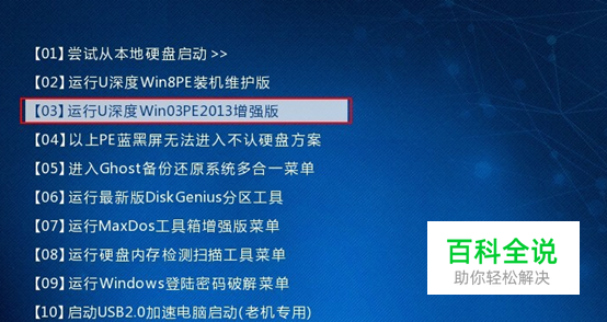 第二步:使用快捷键进入u深度启动u盘winpe系统 文件拷贝完成后重启电脑,在出现开机启动画面时连续按下启动快捷键进入到启动项选择窗口,通过键盘上的方向键将选择u盘,然后按下回车键进入到u深度u盘启动主菜单画面,不同类型以及不同品牌的电脑对应的启动快捷键各不相同! 点击查看 ==》u盘启动快捷键查询 使用快捷键进入到u深度u盘启动主菜单画面时,选择【03】运行u深度win03pe2013增强版选项并按下回车键进入到u深度winpe系统. 如下图所示:
