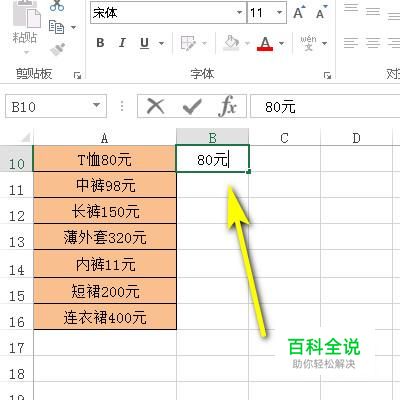 我们在B10中输入80元;然后,鼠标在其它单元格点一下,再点B10单元格,再按下CTRL+E;下面单元格即自动把其余的价格提取出来。