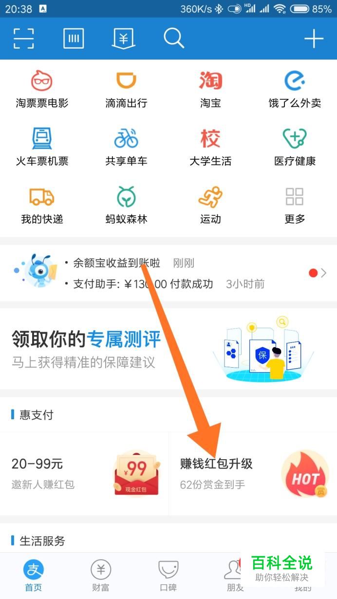 打开支付宝APP,在主页点击‘赚钱红包已升级‘。