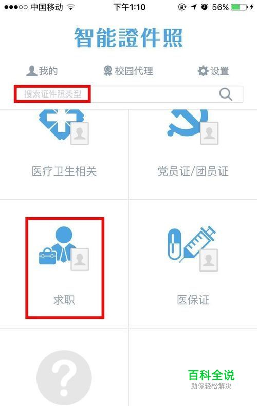 打开智能证件照app进入首页,可以直接搜索事业单位照片或者在列表中找到求职,在求职业点击选择栏,选中事业单位规格,然后点击立即制作按钮。