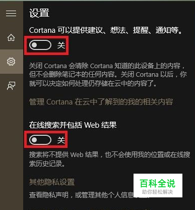 我们点击任务栏小娜(Cortana)搜索框,在弹出窗口中,点击“设置”;将“在线搜索并包括Web结果”关闭。