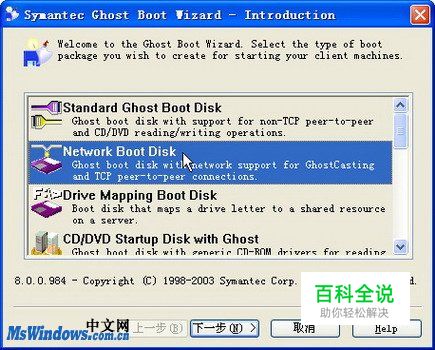 第2步,在打开的“Symantec Ghost Boot Wizard-Introduction(塞门铁克Ghost启动向导-介绍)”向导页中,在启动盘类型列表中单击“Network Boot Disk(网络启动盘)”选项,并单击“下一步”按钮,如图20100414101所示。 图20100414101 选择启动盘类型