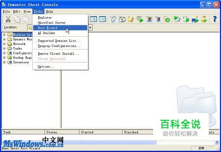 第1步,在开始菜单中依次单击“所有程序”→Symantec Ghost→Ghost Console菜单项,打开Symantec Ghost Console控制台窗口。然后依次单击Tools→Boot Wizard菜单命令,如图20100414100所示。 图20100414100 Symantec Ghost Console窗口