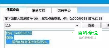 使用蓝屏查询工具,输入116代码可以看到故障的原因,代码0x00000116原因为指定的延伸属性代码无效。