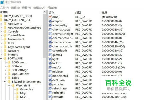 方法同上打开注册表后依次点击-----HKEY_CURRENT_USER------Software------Blizzard Entertainment------Warcraft III------Video,Video目录下分别有两个文件是高度reswidth和宽度resheight这两个参数。