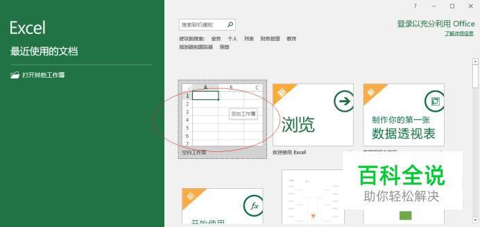 启动Excel 2016电子表格应用软件,如图所示点击屏幕右侧新建空白工作簿。