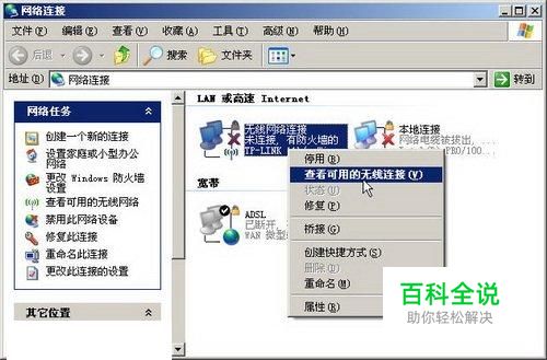 在桌面上右键单击“网上邻居”图标,选择“属性”命令。在打开的“网络连接”窗口中右件单击“无线网络连接”图标,并选择“查看可用的无线连接”命令,如图所示。