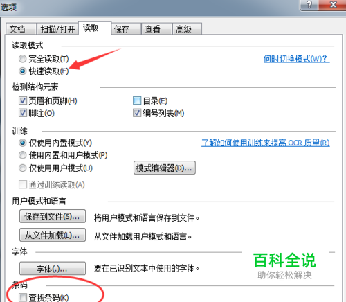 在选项对话框中,点击读取,在读取模式中勾选快速读取,如果不需要查找条码,则不勾选“查找条码”复选框。(接下来开始读取,读取结果的等待时间实际上已经减少了25%)
