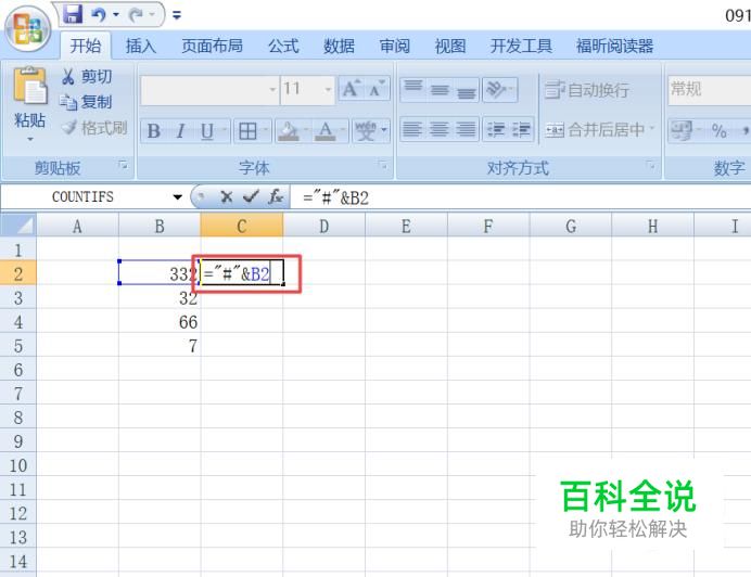 然后我们在图示中的单元格中输入="#"&B2,之后按回车键;