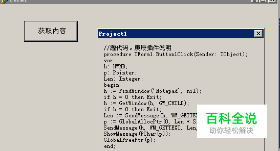 获取打开的记事本中的内容 -------------------------------------------------------------------------------- procedure TForm1.Button1Click(Sender: TObject); var h: HWND; p: Pointer; Len: Integer; begin h := FindWindow('Notepad', nil); if h = 0 then Exit; h := GetWindow(h, GW_CHILD); if h = 0 then Exit; Len := SendMessage(h, WM_GETTEXTLENGTH, 0, 0) + 1; p := GlobalAllocPtr(0, Len * SizeOf(Char)); SendMessage(h, WM_GETTEXT, Len, Cardinal(p)); ShowMessage(PChar(p)); GlobalFreePtr(p); end;