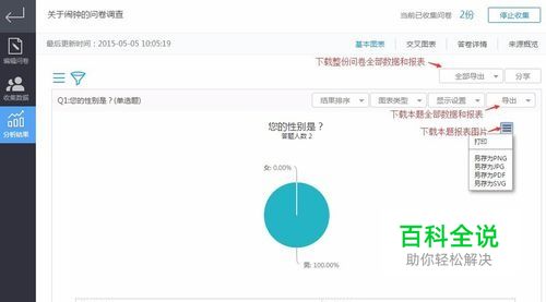 做好了一份问卷,收集完毕,点击分析数据 会看到这个界面,在界面上,你会看见导出的指示 有导出文档,有导出表格,也有直接导成一副高清图