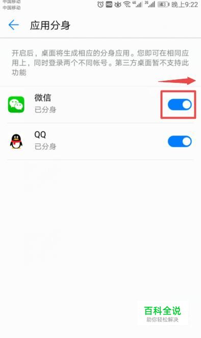 之后我们将微信的应用分身开关向右滑动打开,之后桌面上就会出现两个微信了,然后我们就可以登录两个微信号了。