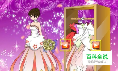 帮新娘子更换婚纱,衣柜里好多漂亮的换啥,选择其中一套合适的婚纱给新娘子穿上。直接点击衣柜左右两边的箭头按钮即可。