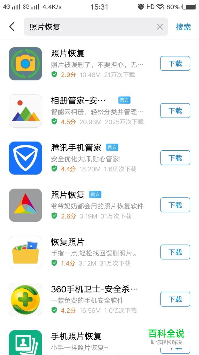 在手机的应用商店中搜索“照片恢复”关键词,会出现一系列的照片恢复软件。选择自己喜欢的或者信任的软件。