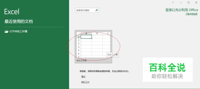 启动Excel 2016电子表格应用程序,如图所示点击界面右侧新建空白工作簿。