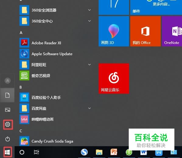 首先,我们点击电脑左下角的微软按钮,弹出的界面,我们点击设置;