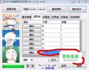 首先下一个RMVX存档通用修改器,调到【道具组】