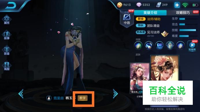 按例先来看英雄技能,这个英雄有两套技能,可能天美爸爸也觉得自己把这个英雄设计的让人暂时无法适应,官方良心的出了一套教学关卡,在英雄界面的名字下方,就是如图框起来的那里。两套技能释放效果是一样的,只是额外效果不一样,一套加血,处于该状态时杨玉环脚下的光环是绿色的,还有一套是攻击被动,该状态下杨玉环脚下的光环是蓝色的。