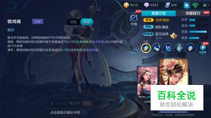 杨玉环是一个不太好操作的英雄,定位是辅助,并不是很高的输出全靠技能,有两套技能,一套可以打出伤害,另外一套主要用来奶队友,给队友不断加血,在下路配合ADC比较能打出这个英雄的水平,不推荐走中路。