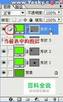 选择图层 如果图像有多个图层,必须选取要使用的图层才能正常的修改图层上的图像,对图像所做的更改只影响这一个图层。一次只能有一个图层成为可编辑的图层,这个图层的名称会显示在文档窗口的标题栏中,在图层调板中该图层旁边会出现画笔图标(图14)。 图14