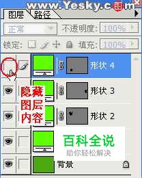 隐藏显示图层内容 在我们不需要对某些图层上的内容进行修改时,可以将这些图层上的内容隐藏起来,设计面板上只留下要编辑的图层内容,这样一来就可以更清楚的对作品作修改了。在图层调板中点击图层旁边的眼睛图标就可以隐藏该层的内容了(图15),再次点击该处可以重新显示内容。 图15 按照此方法同时可以改变多个图层的可视性。