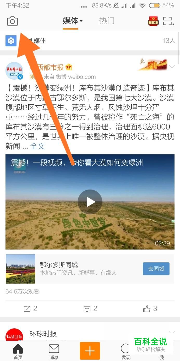 首先进入手机新浪微博客户端首页,然后点击微博界面左上角的照相机图标。