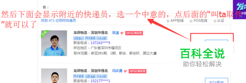 然后底下会出现附近快递员的列表,选择一个,然后点“叫ta取件 ”就可以了,这里网站要求要登录,没有账号的注册一下就可以了。