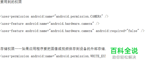 要用到的权限 <uses-permission android:name="android.permission.CAMERA" /> <uses-feature android:name="android.hardware.camera" /> <uses-feature android:name="android.hardware.camera" android:required="false" /> 存储权限——如果应用程序要把图像或视频保存到设备的外部存储上(SD卡), <uses-permission android:name="android.permission.WRITE_EXTERNAL_STORAGE" /> 录音权限——要用音频捕获来录音,应用程序必须请求音频捕获权限。 <uses-permission android:name="android.permission.RECORD_AUDIO" />