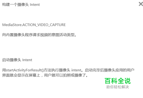 构建一个摄像头 Intent MediaStore.ACTION_VIDEO_CAPTURE 向内置摄像头程序请求视频的意图活动类型。 启动摄像头 Intent 用startActivityForResult()方法执行摄像头 intent。启动完毕后摄像头应用的用户界面就会显示在屏幕上,用户就可以拍照或摄像了。 接收Intent结果 在应用程序中设置onActivityResult()方法,用于接收从摄像头 intent返回的数据。当用户拍摄完毕后(或者取消操作),系统会调用此方法。