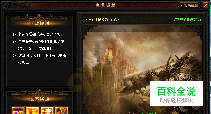 在9377奇迹来了异空间,“血色巫妖”用诡计打伤“大天使维克伊”,夺取了“大天使之剑”用水晶雕像封印在自己的城堡“血色城堡”里。 失去“大天使之剑”的大天使维克伊不但没有力量恢复身体,更不能回归天堂只能停留在异空间。而天使们只能勉强守卫着大天使免受恶魔的袭击,而无力再从血色城堡里夺回“大天使之剑”…… 传说,达到一定等级的勇士都能感受到大天使的召唤,请求帮忙从“血色城堡”中夺取“大天使之剑”,以助大天使复原且回归天堂。成功夺取“大天使之剑”交给维克伊,将会获得大天使维克伊的祝福及礼物。 在奇迹来了血色城堡中妖魔众多,夺取大天使之剑也是危险重重,只有强者和有谋略之人才能通关。下面就由小编来给大家讲解下血色城堡的通关攻略,助你获取高额奖励。 先来看看奇迹来了血色城堡的玩法规则: 1、进入地图,与NPC受伤的大天使对话,得知要先消灭桥上阻拦的怪物才可以达到城门处。 2、破坏城门进入城堡内,消灭10只“骷灵巫妖”,然后才可以攻击水晶棺。 3、攻击破坏“水晶棺”,获取大天使之剑。这些所有小怪会被消灭,出现BOSS“血色巫妖”。“血色巫妖”有机会掉落卓越装备。 4、将大天使之剑交还给受伤的大天使,完成任务领取奖励。 奇迹来了血色城堡每次开启时长为10分钟,通关越快,获得的评价和奖励越高,因此勇士们不要恋战,尽快夺取大天使之剑!血色城堡将根据角色的等级进入不同的场次,等级越高,进入的场次难度也会随着增加,战斗力的提升是很有必要的! 在血色城堡中,鼓舞可以大幅度提升角色的杀怪效率。使用金币有概率提升攻击和生命,使用钻石则100%成功,最高可升到五阶鼓舞,提升100%攻击和生命。想要SSS级奖励,建议进行鼓舞达到3级。 SSS级奖励可获得6260792经验、738000金币和1个血色宝箱,使用后随机获得进阶道具、七彩水晶、强化宝石、双倍经验卷轴、魔魂、金币、中型生命精华、绑定钻石等。血色城堡每天可进入3次,提升VIP可获得奇迹来了VIP特权,增加进入次数。