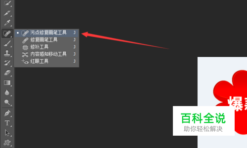 选择工具栏——污点修复——污点修复工具。按住鼠标左键开始涂抹水印“爆款”2字。