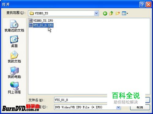 第2步,打开“打开”对话框,在本地硬盘中找到VIDEO_TS文件夹并选中一个.IFO文件。单击“打开”按钮即可播放DVD影片,如图2009020402所示。 图2009020402 选中.IFO文件