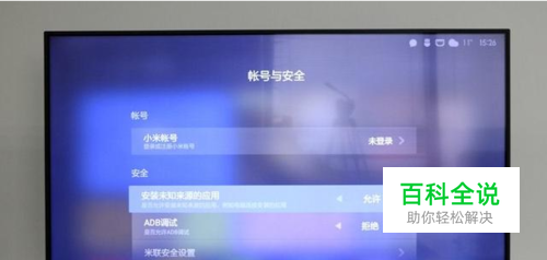 U盘安装法 首先在进入小米电视主页选择“小米电视设置”,找到”账号与安全“选项,将“安装未知来源应用”设置为允许;