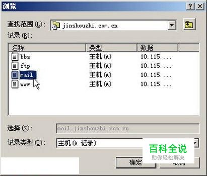 打开“新建资源记录”对话框,在“邮件服务器的完全合格的域名(FQDN)”编辑框中输入事先添加的邮件服务器的主机域名(如mail.msserver.com.cn)。或单击“浏览”按钮,在打开的“浏览”对话框中找到并选择作为邮件服务器的主机名称(如mail),如图所示。