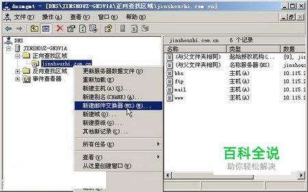 在“正向查找区域”目录中右键单击准备添加MX邮件交换记录的域名,选择“新建邮件交换器(MX)”命令,如图所示。