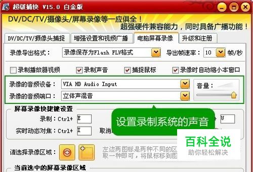“电脑屏幕录像”功能,录制电脑里的声音 点击“电脑屏幕录像”选项卡进行录制 如下图所示,点击“电脑屏幕录像”选项卡,即可录制电脑屏幕的操作画面、网页视频、聊天视频等。在“录像的音频设备”处选择你的声卡名称,在“录像的音频端口”处,选择正确的端口。录制电脑系统的声音,可以选择类似包含”立体声混音”、“stereo mix”、“波形”、“Wave/MP3”、“您听到的声音”、“What you hear”等选项(视具体声卡而有所不同)。如果要录制麦克风的声音,那就选择麦克风相应的选项即可。超级捕快调用的是系统的声卡,建议大家安装声卡的最新官方驱动,以发挥声卡更大的效能。