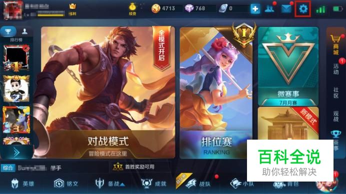 首先点击王者荣耀主界面上方的设置按钮,如下图所示。