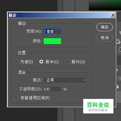 这时,弹出一个对话框。在对话框的“宽度”这里设置参数。比如,设置为10像素。位置这里设置为“居中”;再点确定。