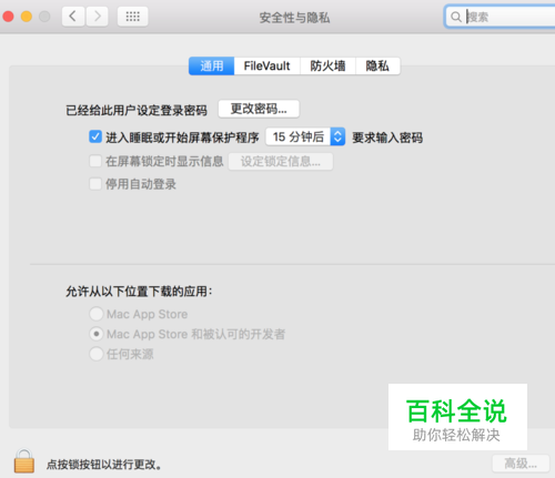 进入之后,点击左下角的锁图案,然后输入密码(开机密码),最后点击“解锁”,完成解锁设置。